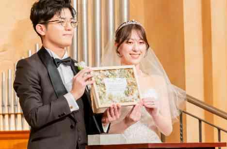 人前式では、ゲストの皆さまと一緒に完成させるオリジナルの結婚証明書を用意しました。証明書には花を飾るスペースがあり、ゲスト一人ひとりに花を入れていただき、最後に新郎新婦が仕上げをして完成。皆さまの祝福が一つの形となり、世界に一つだけの特別な証明書が出来上がりました。大切な思い出とともに、これからもおふたりの歩みを見守る宝物になりました。