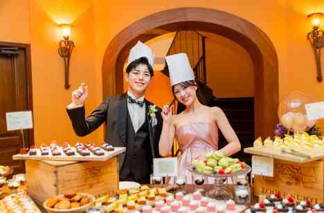 デザートビュッフェでは、新郎新婦がコック帽をかぶって登場。おふたり自らゲストにスイーツをサーブしながら、会話や写真撮影を楽しみました。和やかな雰囲気の中で、ゲストとの距離がぐっと近づく特別なひとときに。ゲストの方からもより一層おいしく感じるというお声をいただきました。おもてなしの気持ちが伝わる、笑顔あふれるデザートタイムとなりました。