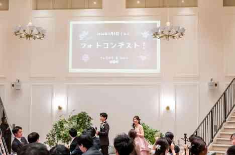 ゲスト参加型のフォトコンテストでは、披露宴中に撮影した写真と映像を投稿してもらい、おふたりが受賞作品を選ぶという楽しい企画を実施しました。実はこの企画、新郎新婦が学生時代の文化祭で行った思い出のイベントをきっかけに、当時の同級生も参列している結婚式でも行いました。おふたりの青春の思い出と重なる、笑顔いっぱいの参加型演出となりました。