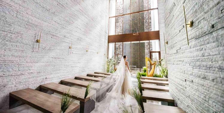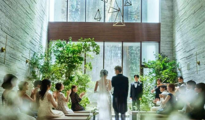 天井高12m、3フロア吹き抜けのチャペルは、自然光が降り注ぐ開放的な空間。高さ12mの滝がゆったりと流れ、天然石の壁と美しい聖歌隊の歌声が調和する、まるで自然の中にいるかのような神秘的な雰囲気が魅力です。ここでしか味わえない感動のセレモニーを体感して