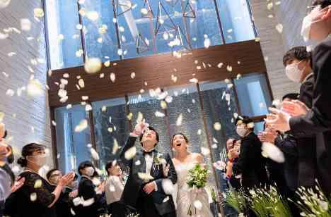 ゲスト参加型の人前式セレモニーをしたいとお考えのおふたりは"ウェディングキャンバス"を行い、世界にたったひとつのアートを完成させました。挙式の結びにはL2126オリジナル演出のフラワースコールを。天井高12mの高さから、花びらが降り注ぎます。花・拍手・天然アロマの香りに包まれ、おふたりのこれからの未来のような華やかな退場シーンとなりました。