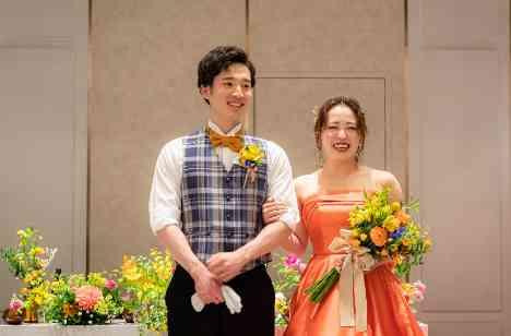 お色直しは会場の装花にもぴったりなカラードレスをセレクトされました。新郎様も新婦様のドレスに合わせてコーディネート。おふたりらしいお洒落なコーディネートに。 パーティーの後半には披露宴会場のすぐ隣にあるチャペルにて、おふたりからゲストへサプライズでデザートビュッフェをご用意!チャペルを背景におふたりとお写真を撮ったり、デザートビュッフェを楽しんだりとアットホームな空間になりました。