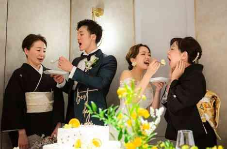 ウェディングケーキもおふたりの好きなペットの足跡をモチーフにフルオーダーでお作りしました。 ファーストバイトの後には、育ててくれてありがとうの気持ちを込め、お母様にサプライズでサンクスバイトを。笑顔いっぱいのおふたりと、少し照れながらも嬉しそうな表情のお母様。感謝の気持ちが伝わる素敵な時間になりました。
