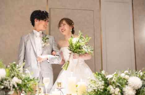 ナチュラルな雰囲気にしたいと専属のフローリストとこだわってお打合せを重ねたおふたり。会場装花やウェディングブーケはグリーン×ホワイトでまとめ、L2126の洗練されたシンプルなパーティー会場にグリーンが映え、とてもお洒落な雰囲気に。パーティー後半には会場の照明を落としキャンドルがゆらゆらと揺れるナイトパーティーのようなロマンティックな雰囲気になりました。