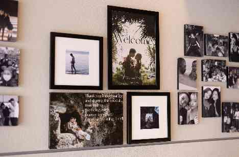 L2126の特徴でもある洗練されたカフェのようなウェルカムラウンジ。 新婦様はウェルカムグッズのご自作を頑張ってくださいました。モノクロにプリントアウトした前撮りやお子様のお写真をフォトパネルにして壁一面に飾りました! お化粧室のミラーにもサプライズでおふたりからのメッセージを。完全貸切のL2126だからこそ叶うおもてなしです。