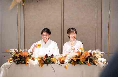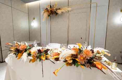 新婦様のこだわりポイントは会場装花。 オレンジ・ベージュ・ブラウンをテーマカラーに小瓶にパンパスグラスやアンスリウムなどを入れ、秋らしくトレンド感たっぷりのコーディネートになりました。会場の照明を落とすと、ゴールドのフローティングキャンドルが煌めき、ナイトパーティーのような素敵な空間になりました。