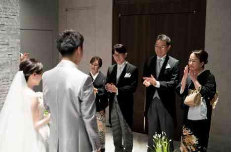 挙式前にチャペルにて両家親御様とのファーストミートを行われました。 披露宴中はなかなかお近くで過ごせないご家族様へ直接感謝の気持ちを伝えられる貴重なお時間です。 大切なお父様お母様へ真っ先にウェディングドレス&タキシード姿をお披露目されました。 純白のドレスに身を包まれた美しい花嫁姿に思わず笑顔と涙が溢れます。