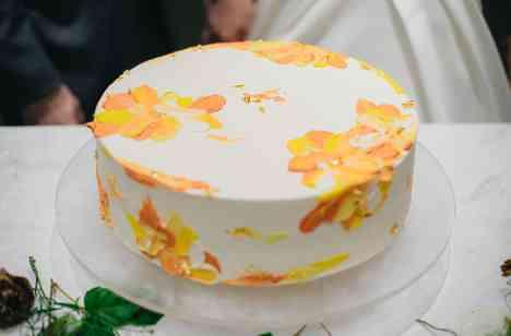 とてもお洒落なおふたり。ケーキにもこだわりたい!とオリジナルウェディングケーキを用意しました。オレンジや黄色のナッペでデコレーションし、仕上げに金箔をつけました。L2126の特徴であるデッサンで一から作るケーキは、おふたりのエッセンスを加えた世界に一つしかないケーキです。ケーキの登場に「かわいい!」「オシャレ!」と大盛り上がり!お写真も沢山撮っていただき、ゲストからも大好評でした。