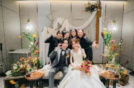 大きな演出などはあえてされず、「素敵なお写真を残したい」という思いがあるご新婦様。歓談のお時間をたくさんとりました。カジュアルなパーティがご希望で、メインテーブルをソファでコーディネート。フラワーコーディネーターとオーダーメイドでつくりあげた装花はこだわりポイントの一つです。彩り豊かなお花は、会場をより華やかにしました。アイテムひとつひとつにこだわる空間で温かなパーティとなりました。