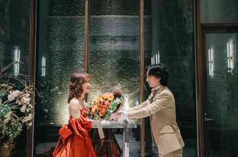 披露宴が結び、ゲストのお見送りをした後になんとサプライズが!チャペルでゆったりと流れきらめく滝をバックに、ご新郎様からご新婦様へ花束をプレゼント。ご新郎様がドキドキしながら渡す様子に、新婦様は思わず笑みがこぼれ、素敵な瞬間となりました。 その後、専属カメラマンよりチャペルでの記念撮影も! お写真を当日たっぷり撮影できるのも、お二人とお二人のゲストだけで貸し切りにできるL2126の魅力です。