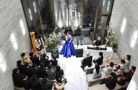お色直しの準備が整い、いよいよ再入場☆ すると司会者よりゲストの皆様へチャペル前のカーテンに移動していただくようアナウンスが! カーテンがオープンするとそこには衣裳チェンジされ、ベースとマイクを持ったお二人の姿が!なんとパーティ後半はお二人のバンド演奏からスタート♪ 突然の演奏に皆様驚きながらも大盛り上がり☆ 歌声に聞き惚れる素敵な時間が流れていきました♡
