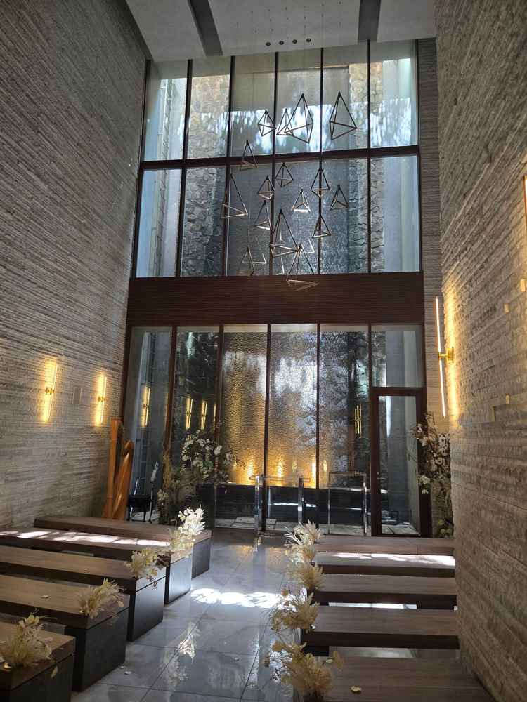 チャペルと披露宴会場が隣同士で移動が少なくわかりやすいのが良いと思った。 雨でも特に困らなそうである。