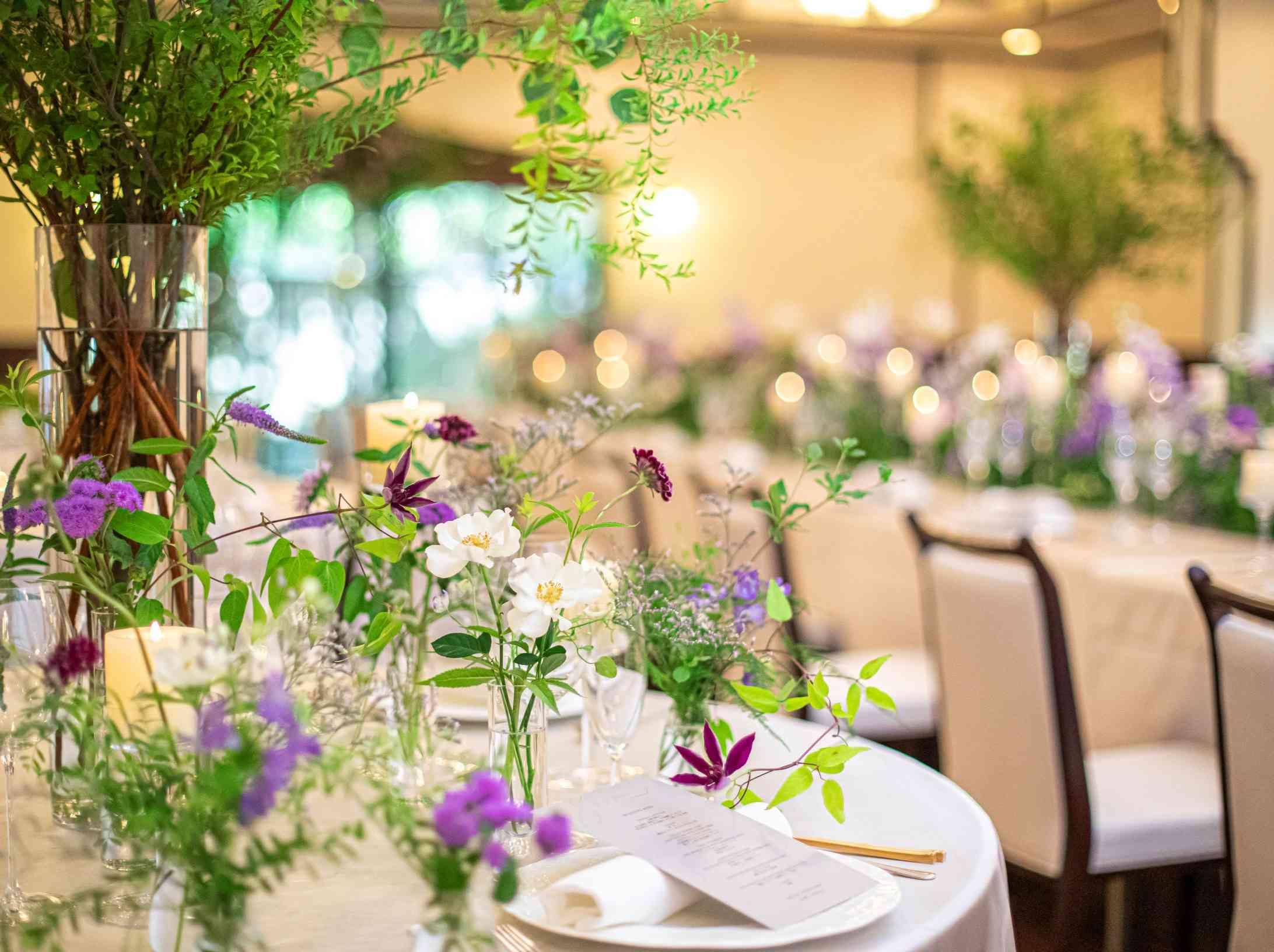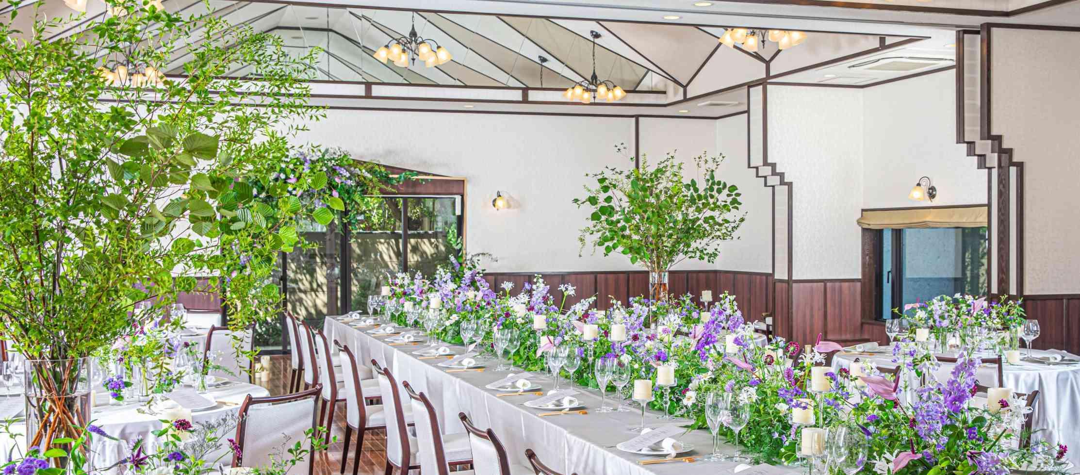 大正時代の酒蔵を改装したアールヌーボー調の木造建築。 「折鶴」をイメージした天井や滝の流れる窓辺は明るく開放的な雰囲気で、 ハレの日を一層華やかに彩ります。