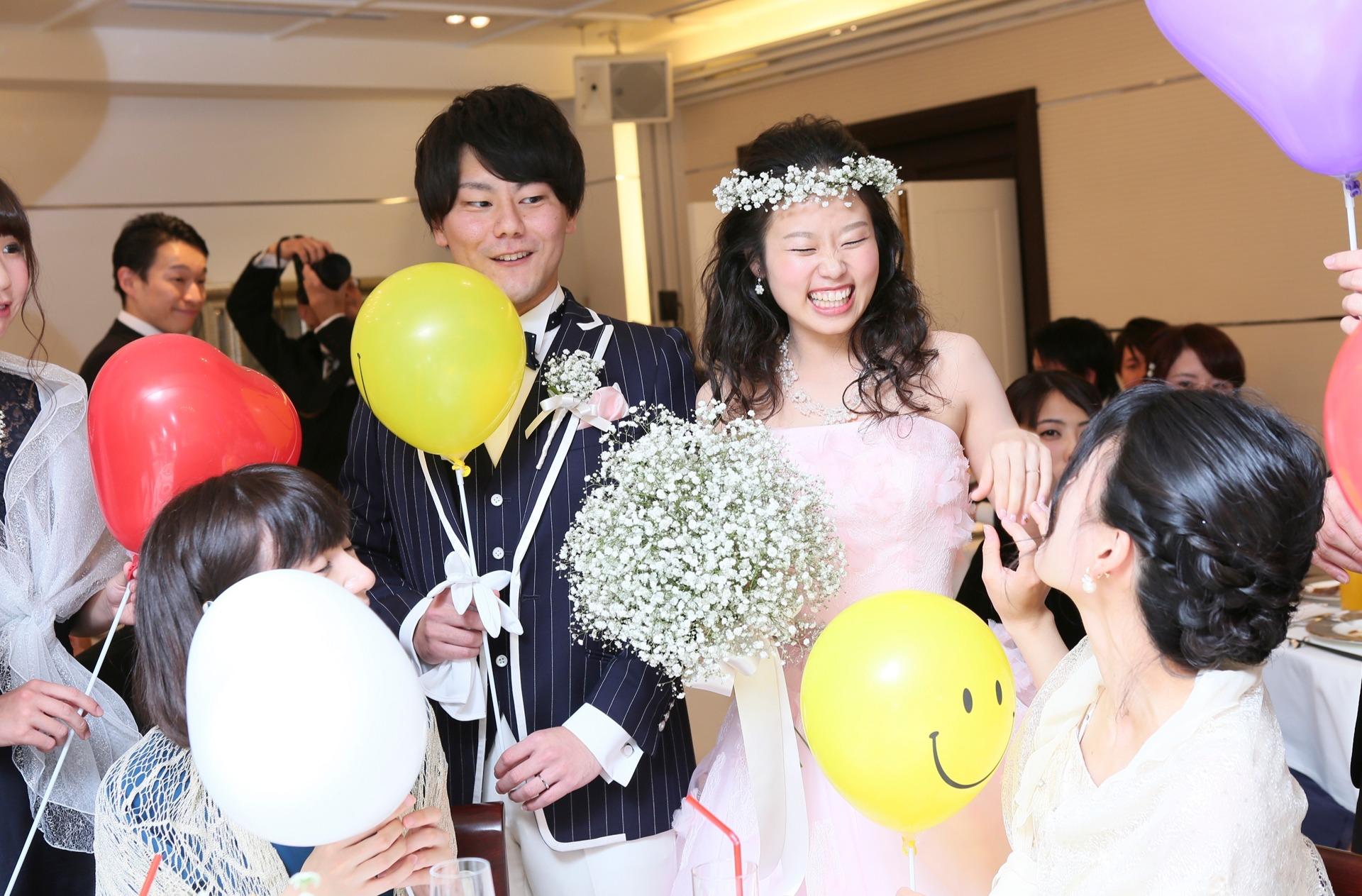 おふたりとも、お母様にエスコートして頂き、お色直しのご中座です。ご中座の際は、大好きなひよこのキャラクターのぬいぐるみがおふたりのお席に座り、お留守番をしていました!やわらかい雰囲気のパステルピンクのドレスに、あわせて選ばれた白いラインが入ったタキシード、おふたりともとてもお似合いです*再入場後、ラウンドテーブルをして皆様とお写真を撮りました!真実さんの弟さんがお写真担当として一緒にまわりました♪