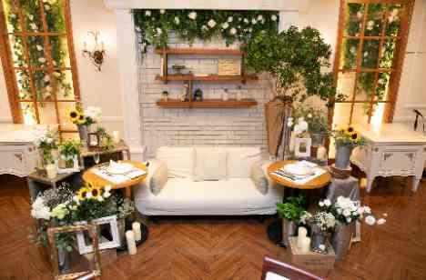 披露宴会場内のおふたりの高砂はソファ席に♪白とグリーンを基調とした中に、季節感を感じる「ひまわり」をプラスして華やかに会場を彩ります。ソファ席は新郎新婦様の全身の姿をゲストの方々に見ていただきやすく、新郎新婦様自身も動きやすいなどの利点が。また隔てるものがないため、ゲストの方々との距離もより近く感じることができ、ご歓談の時間も新郎新婦様を囲んでのフォトブースとして盛り上がることまちがいなしです…♡