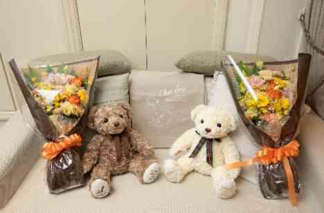 新郎新婦様か親御様へ感謝の想いを込めて披露宴のフィナーレで贈られる記念品。 おふたりはウェイトベアと花束をご用意されました。ウェイトベアとは、新郎新婦様が生まれた時の体重と同じ重さで作られる世界にひとつだけのぬいぐるみ。そのぬいぐるみを抱っこした時によみがえるこれまでの思い出や、今日まで育ててくれたことへの感謝の想いが溢れる特別な贈り物です♡