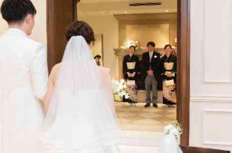お二人がお仕度を終え、向かった先はチャペル。 挙式前にご家族との時間も過ごしたいというお二人の想いから、ファミリーミートの演出を考えたお二人。ご両親が集合している中、チャペルの扉がオープン! お二人の姿を見て、ご両親様も想いが溢れます。 ファミリーミートはご家族と特別な時間を過ごせる感動の演出の一つです♡