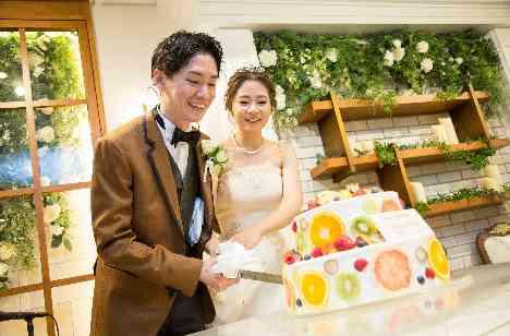 ケーキ入刀は、フルーツをあしらったオシャレで可愛らしい2段ケーキで♥ カラフルなデザインに、ゲストの皆様もテンションが上がります。お互いにファーストバイトをして盛り上がりました!ゲスト様の笑顔に会場が包まれた瞬間でした!