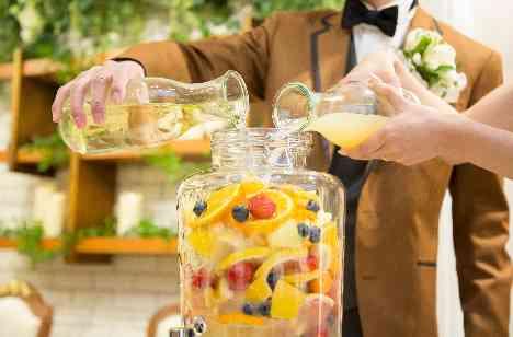 おふたりこだわりの演出は、ゲスト参加型のサングリア作り。ゲスト様には、自由にミックスフルーツを入れていただき、最後のお仕上げとして、お二人で白ワインをジャーに注いで完成です☆ ゲスト参加型の演出で大変盛り上がりました!