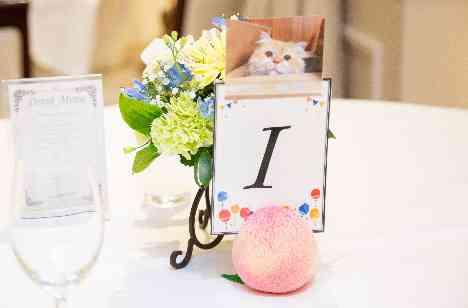 おふたりが大好きな猫とご新婦様のお名前に入っている“桃”をテーマに、テーブルナンバーをお手作りされました。可愛らしい装飾にゲストも思わず笑顔に♪他にも結婚証明書も猫の形のものにしたり、ウェディングケーキにも可愛らしいピンクの桃のマジパンを乗せ、お二人の好きなものを詰め込んだ結婚式を作り上げました。