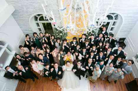挙式後のセレモニーにもこだわったお二人。チャペルの吹き抜けから撮る全員集合写真では、お二人もゲスト皆様も同じポーズでパシャリ!テーマにちなんで「招き猫」のポーズはおふたりのご指定でした♡そのあとは、ご新郎様ご新婦様のお二人でプレゼントトス!ゲスト参加型の演出を盛り込むことで、ゲストをおもてなししたいというお二人の想いがゲストの皆様にも伝わる素敵な時間でした。