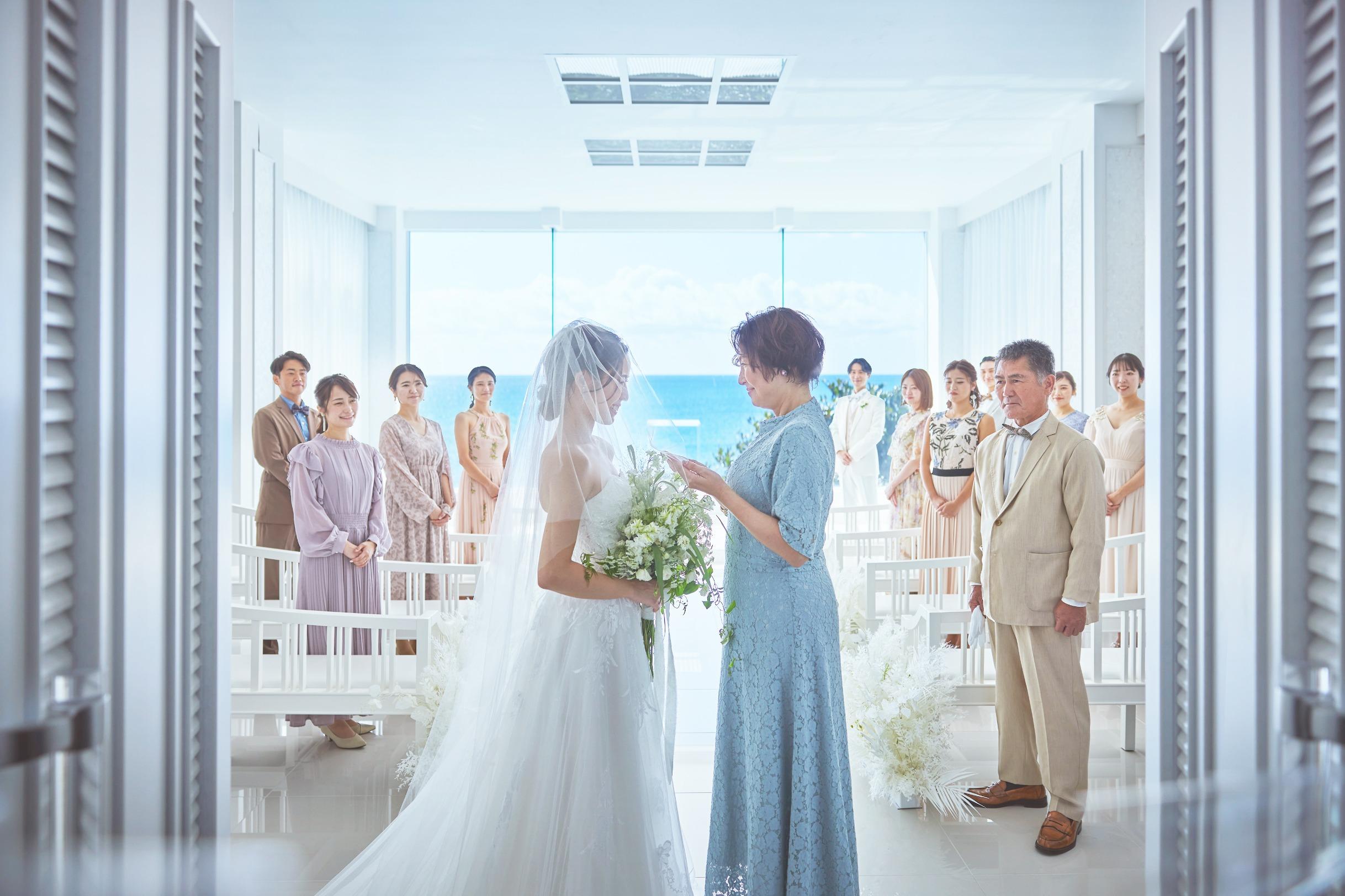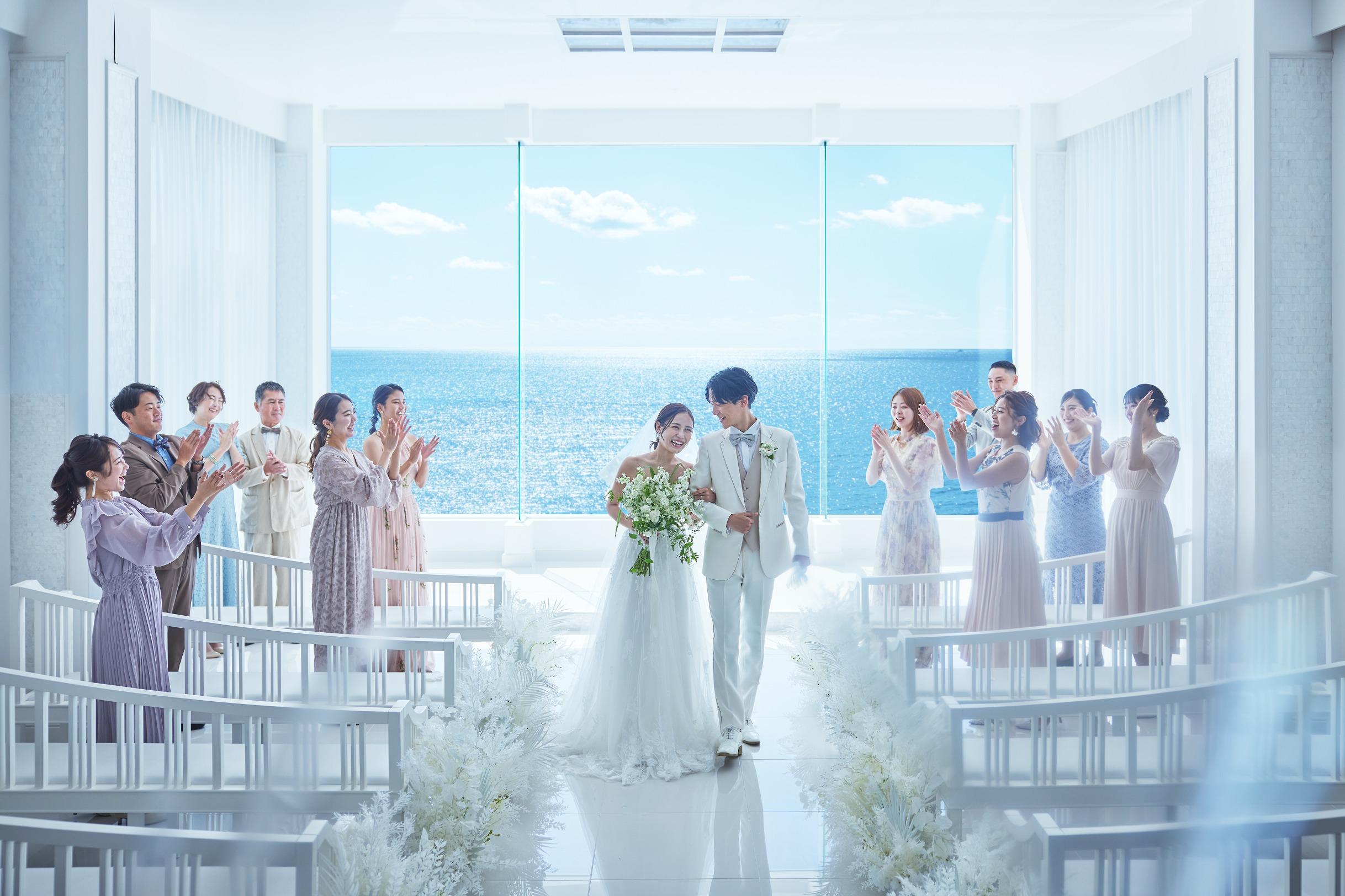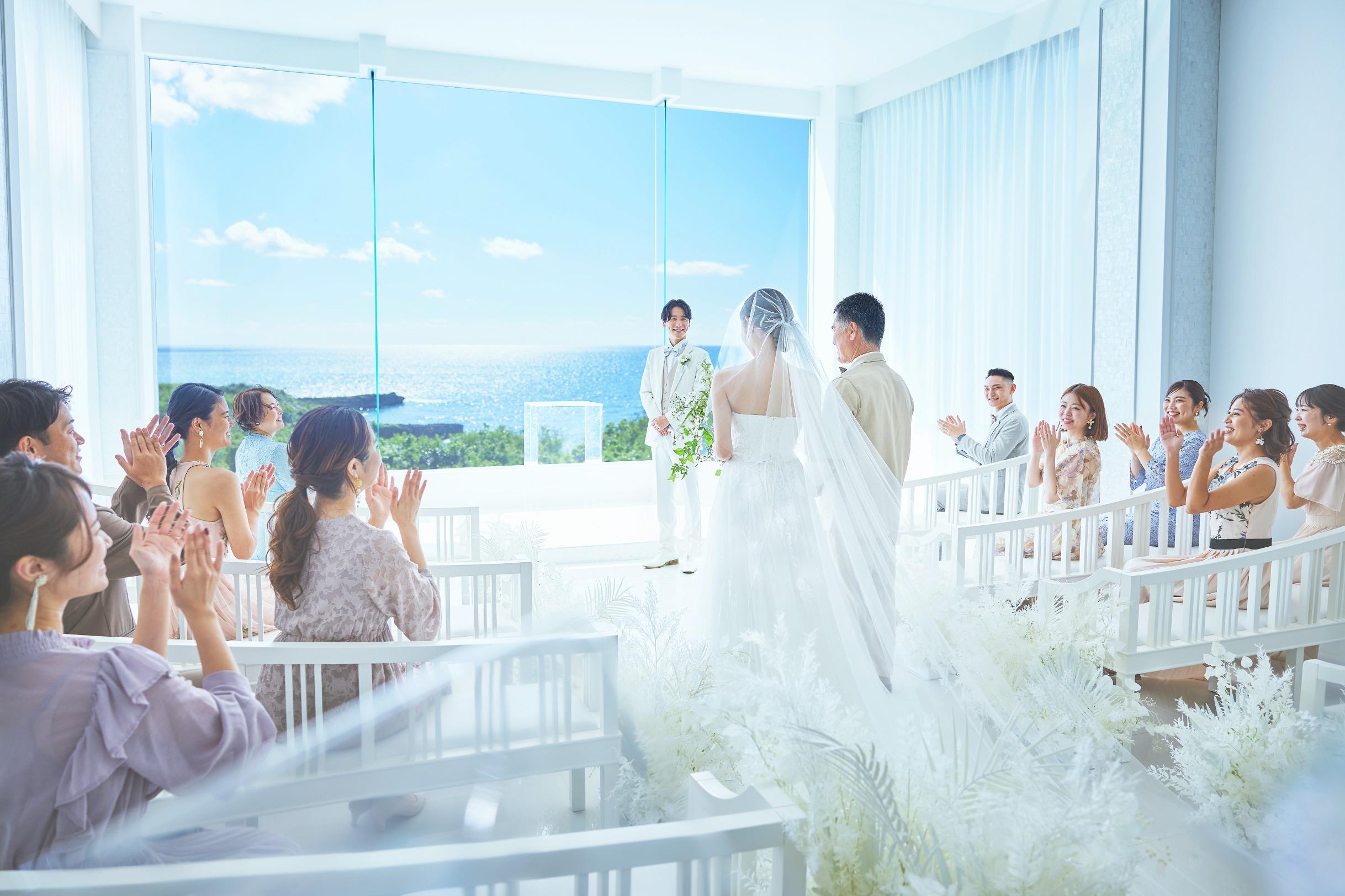 扉を開けると、鮮やかな宮古ブルーの水平線が目の前に広がり 3方向からまばゆい光がたっぷりと降り注ぐ、伊良部島内唯一のチャペルです 海と空を感じながら、家族に見守られてアットホームな挙式が叶います