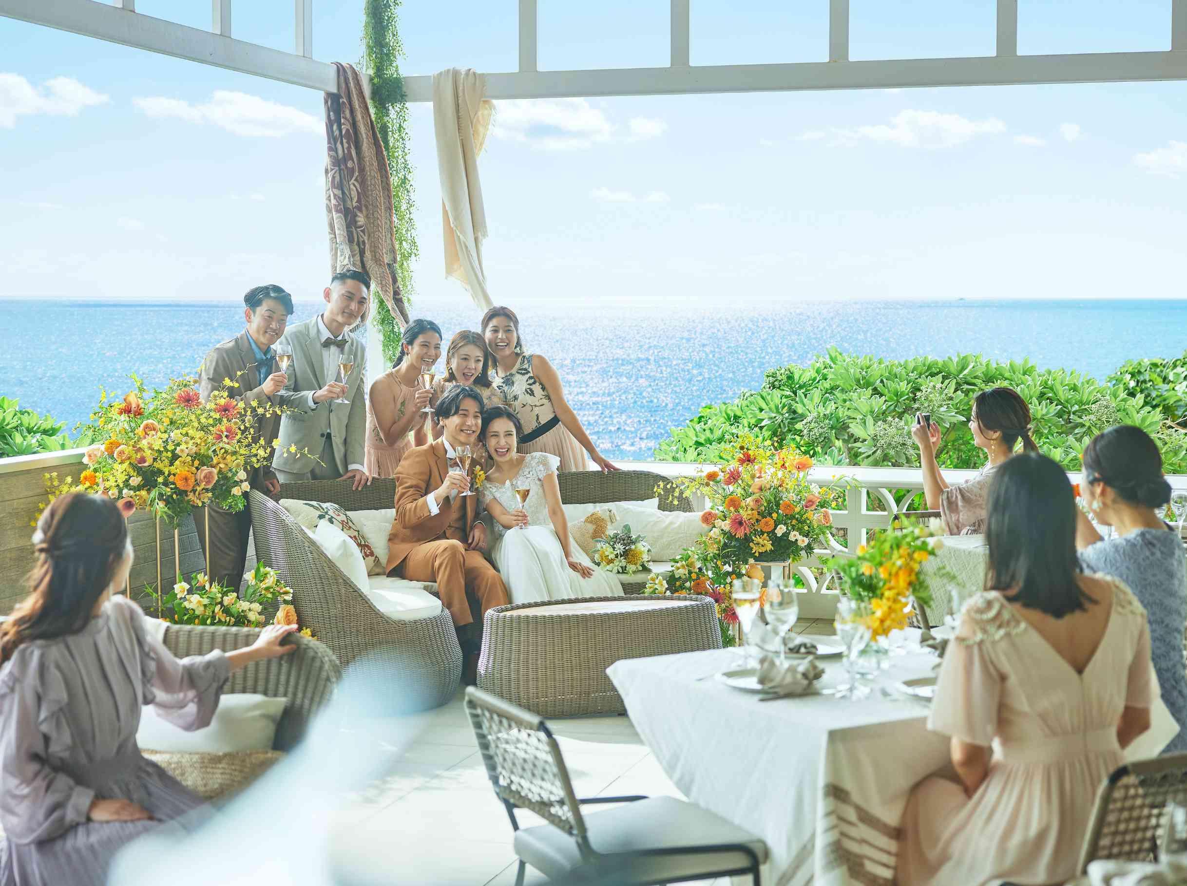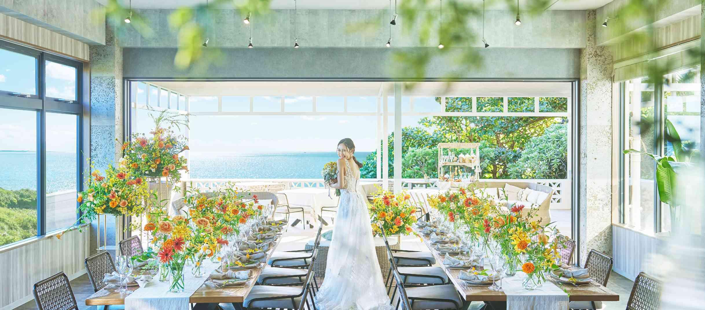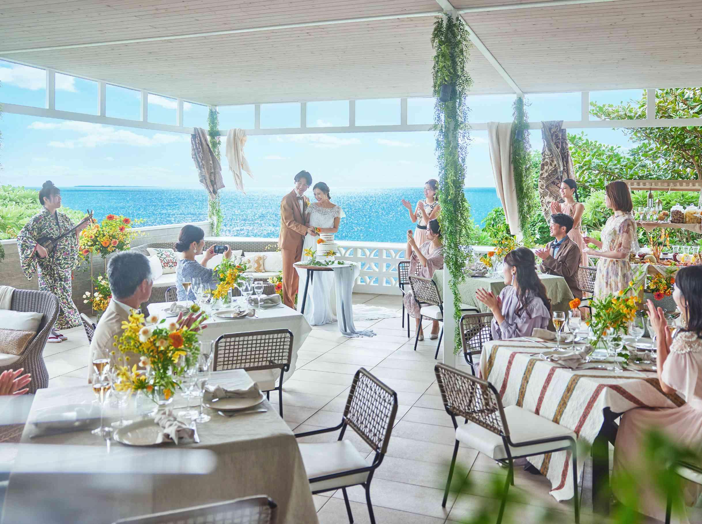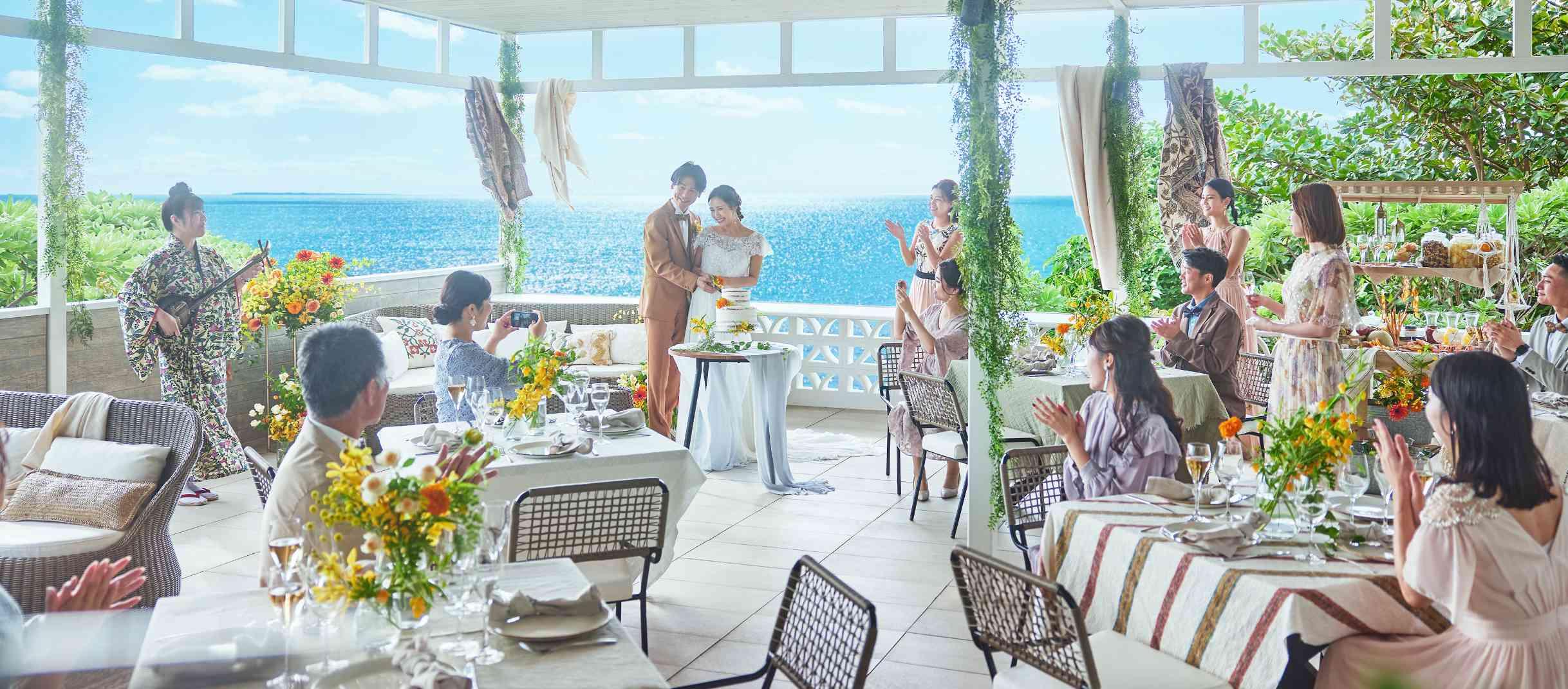 宮古島の景色を一望できる、開放的なテラス付オーシャンビューレストランを貸切って、おふたりらしいパーティを実現。大切なゲストの皆様と自然体でスローな非日常をお過ごしいただけます。