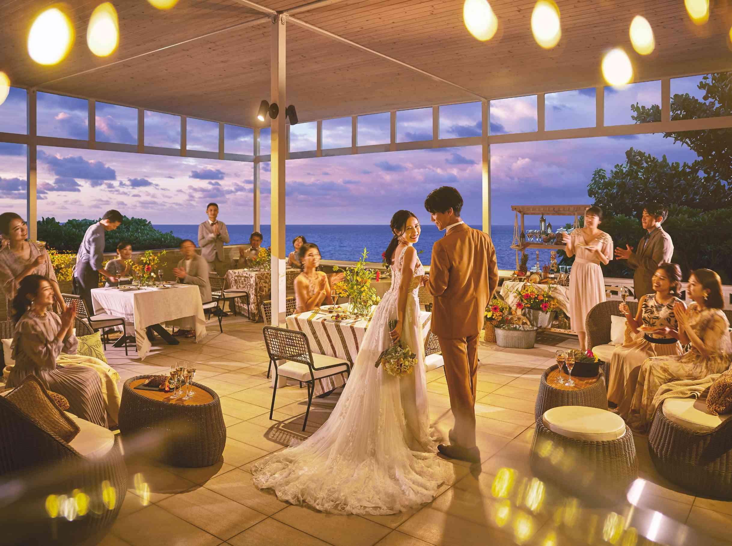 レストランに隣接したテラスでは、南国の美しい空と青い海を眺めながらの贅沢な時間を。 沖縄文化を感じる華やかな演出や心地よい音楽、水平線に沈む夕日がロマンティックな雰囲気を作りパーティー時間を満喫!