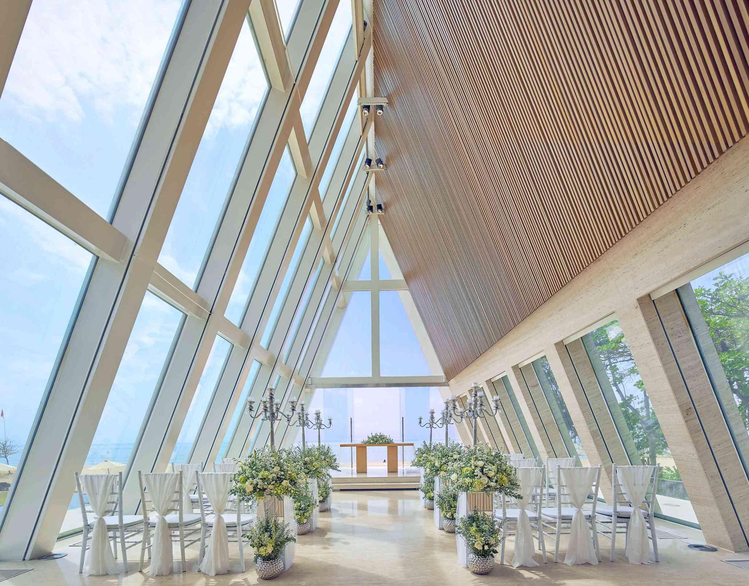 圧倒的なインフィニティプール22メートルにも及ぶウォーターアプローチと 新郎新婦が支えあう姿をモチーフとしたチャペルが圧巻。 美しい海を目の前に幸せを包み込むチャペルセレモニーを。