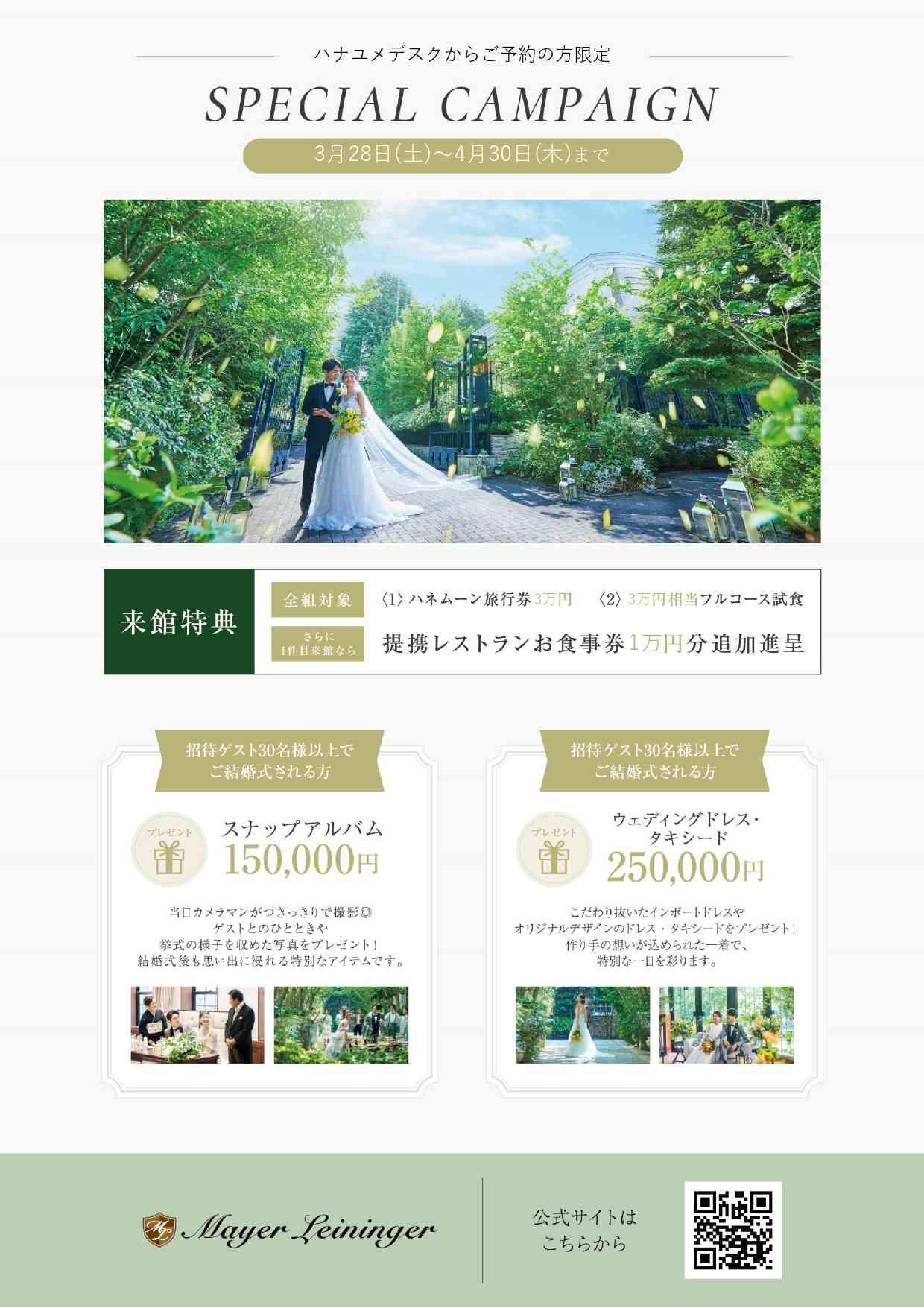 青空の下、緑に囲まれたフラワーロードで、メーヤー・ライニンガーならではの特別な写真撮影が可能。施設内には、大理石の床や上品なステンドグラス、シンボルツリーなど、ドレス映えする多彩なフォトスポットも揃う