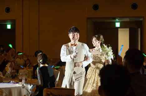 ゲストが一緒に楽しめるよう、いくつかの参加型演出を取り入れました。特に盛り上がったのが、ドレス色当てクイズと参加型ゲームです。再入場のときにはサイリウム演出を行い、会場が一体となって輝くような瞬間に。また、デザートブッフェも用意して、ゲストが自由に楽しめる時間をつくりました。笑い声と拍手が絶えない、まさに理想のパーティーになりました。