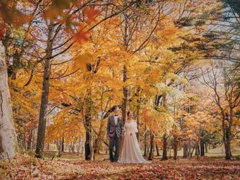 軽井沢の広大な森と鮮やかな紅葉に包まれる映画のようなロケーションフォト