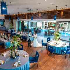 【1日1組貸切邸宅ウエディングが叶う場所】大きな窓から広がる海景色が、どこを切り取っても写真になる「THE BLUE」。プールのキラキラとした光とアットホームな空間が重なり、パーティーシーンをより特別に演出します。お庭やテラス、充実の設備にも注目!