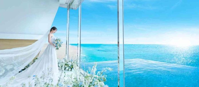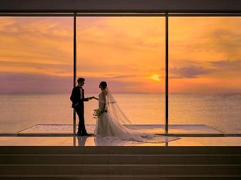 美しい海と空を眺めるオーシャンビューの新舞台で永遠の愛を誓う。