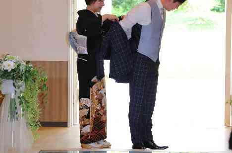 お二人様が選ばれたのは教会式です 新郎様の登場シーンで行われたのはジャケットセレモニーです これは親御様によるお仕上げです ジャケットを着せていただいたあと、白のグローブを親御様からお預かりいただきます 「これからは奥さんを守っていくんだよ」というメッセージが込められています ご見学のときから、新婦様がやってほしいと仰っていたセレモニーで、より新郎様の決意が強くなったのではないでしょうか