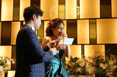 披露宴のクライマックスでは、親御様へ宛てたお手紙を読まれました 読んでいるうちにおさえきれない思いで、涙をされる新婦様 そっと見守られる新郎様 会場中が感動に包まれました お手紙のあとは、花束と生まれたときの体重のベアをお渡しされておりました お二人様にとっても親御様にとっても忘れられない瞬間になったはずです