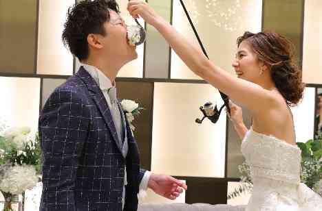 ケーキ入刀の後はやっぱりお二人によるファーストバイト☆ その前に両家の親御様にご登場いただき、お手本という形で親御様に食べさせ合いっこをしていただきました まずはお父様からお母様へ、そしてお母様からお父様へ 恥ずかしそうですが幸せな様子にお二人もすごく笑顔でした その後はお二人によるファーストバイト 新婦様から新郎様のときにはなんとつりざおでファーストバイト! 会場中に笑顔が溢れました