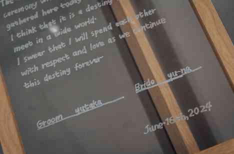 ゲストの皆様と一緒に結婚式を作りたいとのことで 新郎様の手作りのウェルカムグッズを作っていただき ゲストの皆様に名前を書いていただき 挙式で書名所として使っていただきました。 そのほかにもしっかりと手書きで皆様にメッセージを書いていただき普段感謝の気持ちを伝えれていないとのことで お手紙も書いていただきました