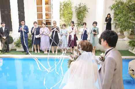 プールを挟み、新郎新婦様とゲストの方で行うブーケプルズ。新郎新婦様もゲストの方も誰に当たるかドキドキしながら行う演出♡笑顔が弾け、会話も弾むアットホーム時間になりました。プール付きガーデンだからこそ行える演出の1つですね!