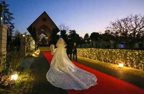 元々はクリスタルチャペルでの挙式を予定していたものの、披露宴会場が夕方に変更になったため、イルミネーションが綺麗なガラスのチャペルに変更。 昼間の雰囲気とは異なる幻想的な空間は、参列したゲストからも「今まで見たことない」と大絶賛。 煌びやかにライトアップされたバージンロードが、ふたりをより一層輝かせてくれました。