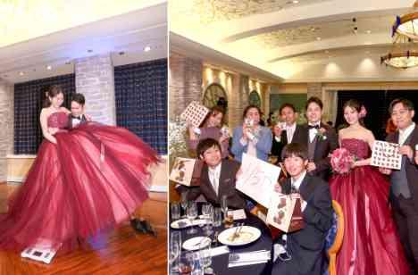 クリスタルチャペルの隣に位置するオーシャンブルーでの披露宴。 余興では新郎がドレス姿の新婦をお姫様抱っこした状態で、ふたりの合計体重を当てる「体重当てクイズ」を実施。ゲスト同士の会話も盛り上がり、楽しい演出になりました。 カラードレスに選んだ鮮やかなワインレッドのドレスは、新郎やお母様からのアドバイスで試着したドレス。 「自分ひとりでは選ばなかった色」という1着が、運命のドレスになりました。