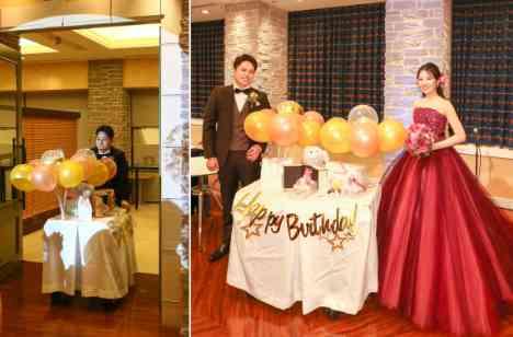 結婚式当日は新婦の誕生日ということで、披露宴の終盤に新郎から新婦へバースデープレゼントのサプライズが。 新郎が実家でこっそり準備したバルーンの装飾やプレゼントは新婦も当日まで一切気付かず、サプライズは大成功! ゲストからの祝福も感じ、誕生日にまたひとつ、ふたりの素敵な思い出を積み重ねることができました。