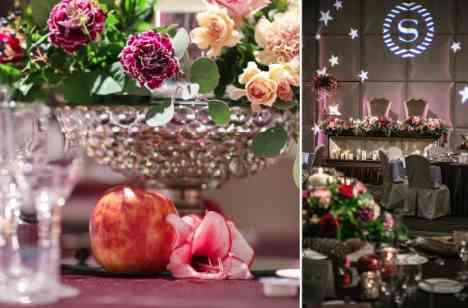 日比谷花壇のエグゼクティブフローリストにデザインを依頼。 赤やくすみピンクを中心とした装花に、林檎や葡萄など本物の果物を置いたコーディネート。THE CLUB Fujiの会場に合わせて、背の高い装花と低い装花を組み合わせて立体的な印象に。ふわっとした装花のイメージを想像以上のクオリティで具現化してくれたフローリストさんにはとても感謝しています。