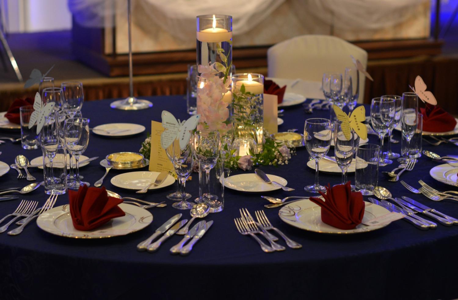 メインテーブルは、正面以外からでも綺麗に見えるよう、横にもチュールを施し、写真映えを意識しました。 ゲストのグラスには、蝶モチーフのメッセージカードをセット。実はひとつひとつ新婦がカットした手作り!大変な作業でしたが、テーブルが華やかになったので、作って良かったです♪