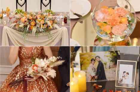 「マーメイドラインのドレスが似合う」と新郎からおすすめされていた新婦。初めて試着をしたマーメイドラインのドレスが運命の1着になりました。ブーケはナチュラルで明るい雰囲気でリクエストし、ウエディングドレスの名前と同じ種類のお花「ミモザ」を一緒に束ねました。 披露宴会場のコーディネートは秋婚らしいテラコッタのカラードレスに合わせた暖色系の装花でまとめ、アットホームな雰囲気を演出しました。