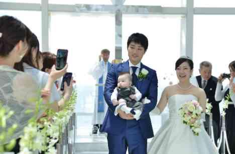 一目ぼれして選んだクリスタルチャペルでの挙式。 新郎は、首からリングをかけてリングボーイとなった息子をだっこして入場。 ウエディングキスのセレモニーは息子を挟んでも3人で!とてもアットホームな挙式になりました。
