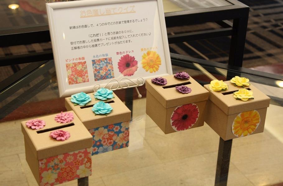 華厳を会場に選んだ決め手のひとつが、独立したウェルカムスペースがあったこと!当日は新婦が心を込めて準備したアイテムの数々を飾りました☆お色直しの色当てクイズには会場の雰囲気に合わせ和装も選択肢に登場!