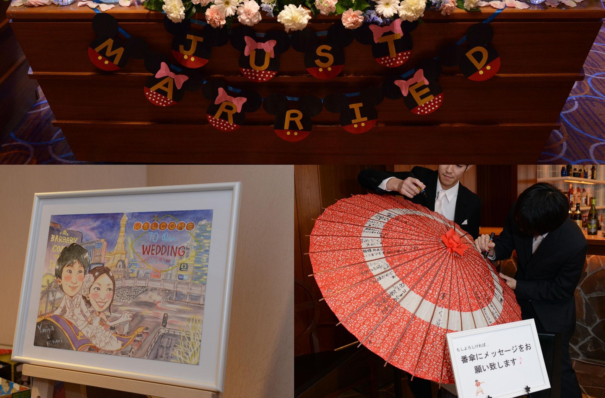 一番頑張ったポイントは「手作り」! メインテーブルにかけたガーランドは2週間かけて2人で手作り。披露宴会場に置いた番傘にはみなさんにメッセージを書いてもらい、再入場で使用しました☆想い出のアイテムやこだわって作ってもらったウェルカムボードも「ふたりらしいね」と好評でした♪