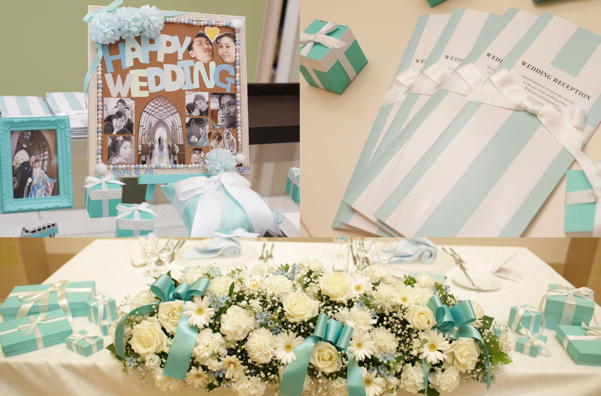 披露宴会場に合う色を考えていた時に思いついたのは、お気に入りの"BLUE"。 大好きな色に包まれた、幸せいっぱいの結婚式になりました!