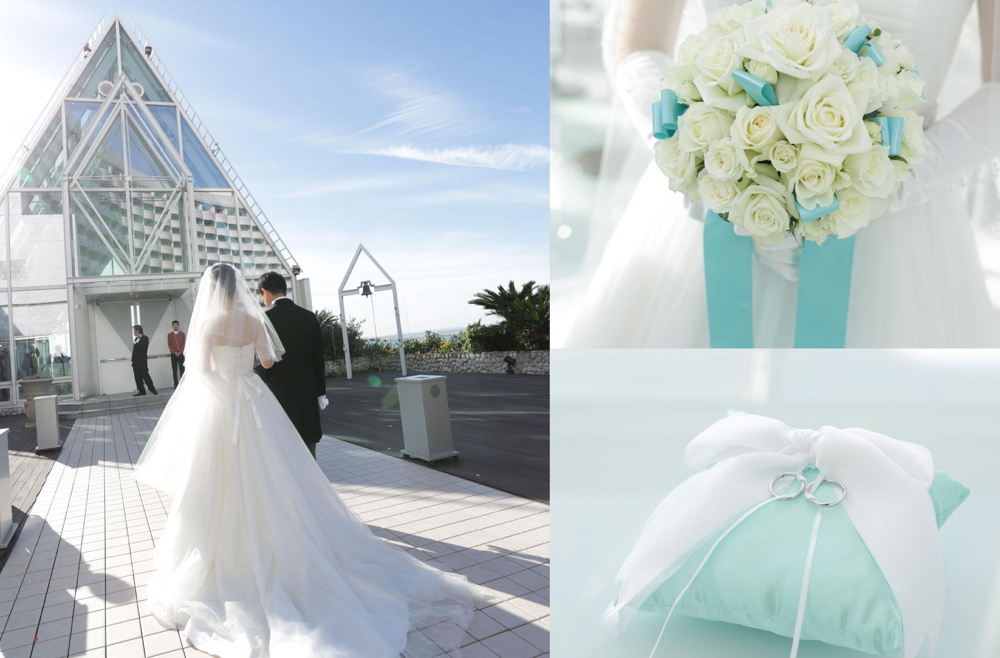 当日は気持ちの良い青空!挙式に使ったブーケやリングピローにも大好きな”BLUE”をあしらいました。